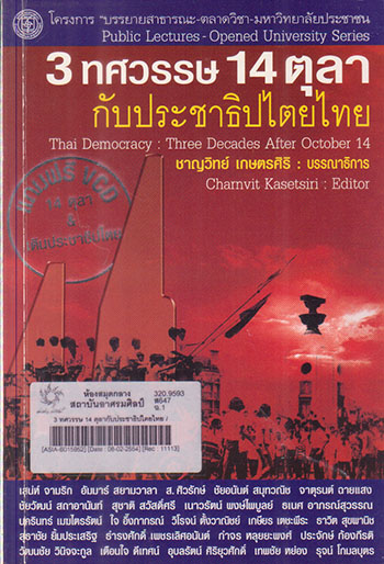 Partial Contents: โครงการ ^"บรรยายสาธารณะ-ตลาดวิชา-มหาวิทยาลัยประชาชน^" -- การเมือง การศึกษา กับทางเลือกของสังคมไทย / เสน่ห์ จามริก -- ปัญหาของประชาธิปไตย : เอกลักษณ์ เสียงข้างมาก สิทธิและความยุติธรรม / เกษียร เตชะพีระ -- วิพากษ์สังคมไทย หลัง 14 ตุลา / ชัยอนันต์ สมุทวณิช -- สามสิบปี 14 ตุลาฯ : ไทยกับนรก สวรรค์ และโลกมนุษย์สากล / ธาวิต สุขพานิช -- อารยะขัดขืนกับสังคมไทย / ชัยวัฒน์ สถาอานันท์ -- ตุลา : เงาอดีตของการเมืองบนแผ่นฟิล์ม / กำจร หลุยยะพงศ์ -- อภิวัฒน์ 2475 / นครินทร์ เมฆไตรรัตน์ -- 30 ปี 14 ตุลา กับปัญหาประชาธิปไตยไทย / ธำรงศักดิ์ เพชรเลิศอนันต์ -- การเมืองไทยในสมัยจอมพล ป.พิบูลสงคราม ครั้งที่ 2 / สุธาชัย ยิ้มประเสริฐ -- วรรณกรรม กับ 14 ตุลา / สุชาติ สวัสดิ์ศรี -- กว่าจะเป็น 14 ตุลา : ความเคลื่อนไหวทางการเมืองวัฒนธรรมของนักศึกษาและปัญญาชน / ประจักษ์ ก้องกีรติ -- ปาฐกถาพิเศษ 30 ปี 14 ตุลา กับประชาธิปไตยไทย / จาตุรนต์ ฉายแสง -- 30 ปี 14 ตุลา กับปัญหาตำราเรียนและหลักฐานจดหมายเหตุ -- 14 ตุลา วันเจตนารมณ์ประชาธิปไตยสมบูรณ์ / ธเนศ อาภรณ์สุวรรณ -- 6 ปีปฏิรูปสื่อ : เราจะไปทางไหนกัน -- ครึ่งศตวรรษ เศรษฐกิจไทย / อัมมาร์ สยามวาลา -- รัฐ การเมืองและอาชญากรรม / ใจ อึ๊งภากรณ์ -- ตุลา ตุลา/ วิโรจน์ ตั้งวาณิชย์ -- อันเนื่องมาจาก 14 ตุลา 2516 : ทัศนะส่วนตัวของ ส.ศิวรักษ์ |