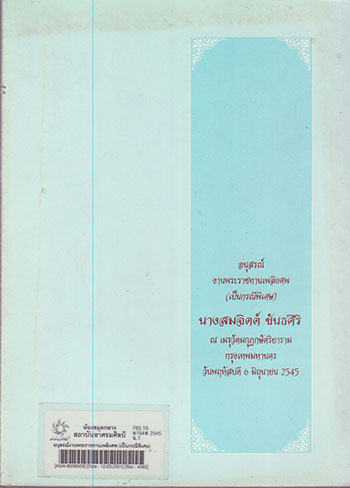 อนุสรณ์งานพระราชทานเพลิงศพ (เป็นกรณีพิเศษ) นางสมจิตต์ ขันธศิริ ณ เมรุวัดมกุฏกษัตริยาราม กรุงเทพมหานคร วัน พฤหัสบดี 6 มิถุนายน 2545 |