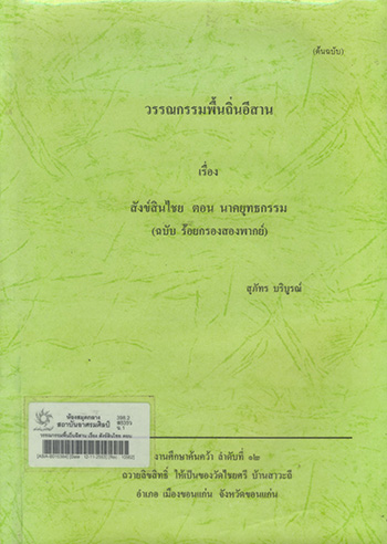 | รายการใกล้เคียง ผู้แต่ง [สุภัทร บริบูรณ์,] หัวเรื่อง [สังข์สินไชย--วรรณกรรมพื้นถิ่นอีสาน] หัวเรื่อง [ถ่ายเอกสารเย็บเล่ม] หัวเรื่อง [นาคยุทธกรรม] |